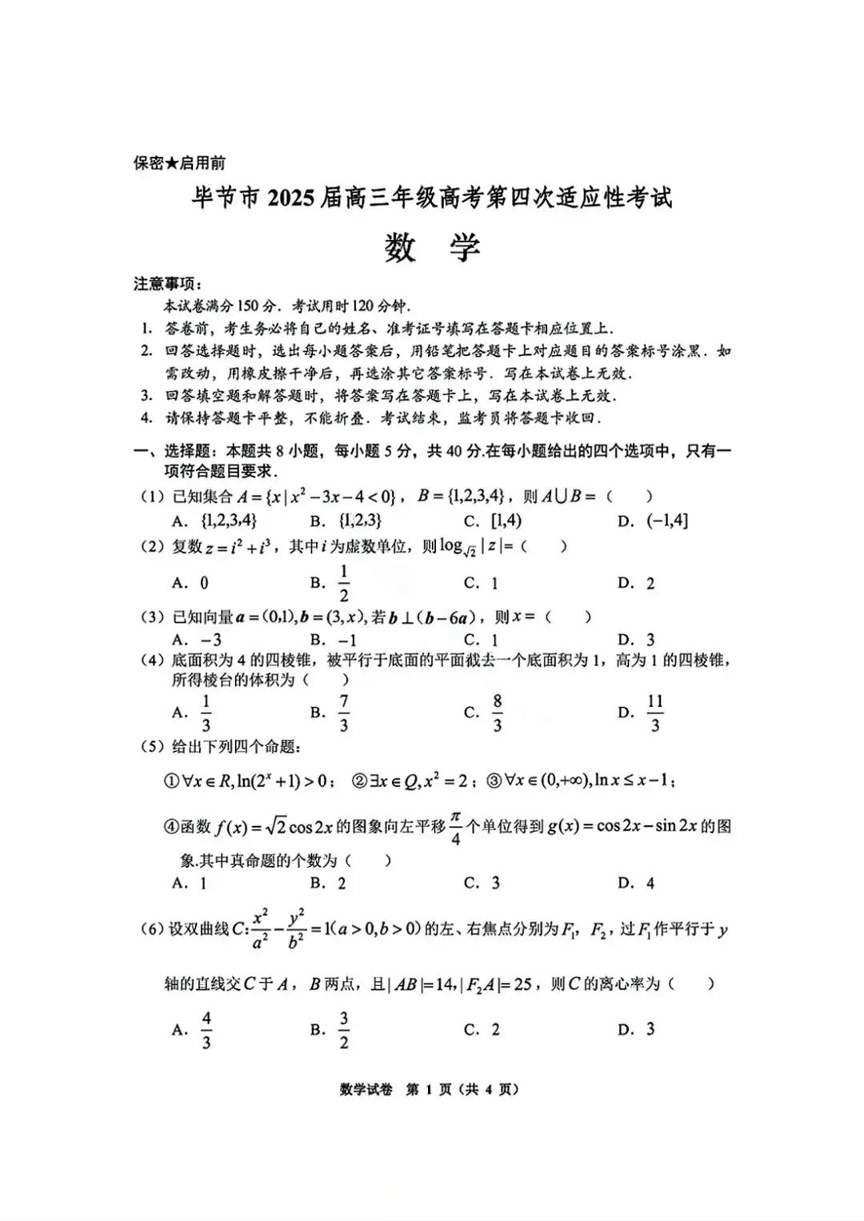 贵州省毕节市2025届高三年级高考第四次适应性考试 数学.pdf