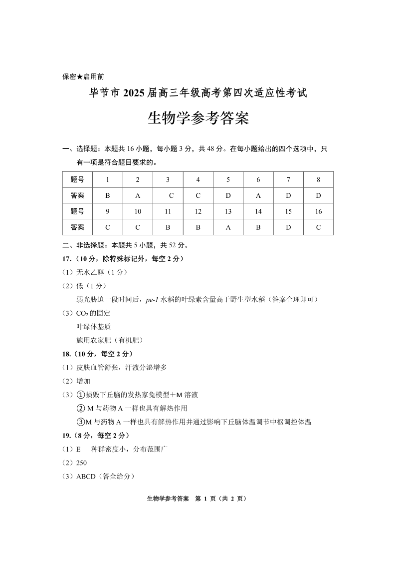 贵州省毕节市2025届高三年级高考第四次适应性考试 生物答案.pdf