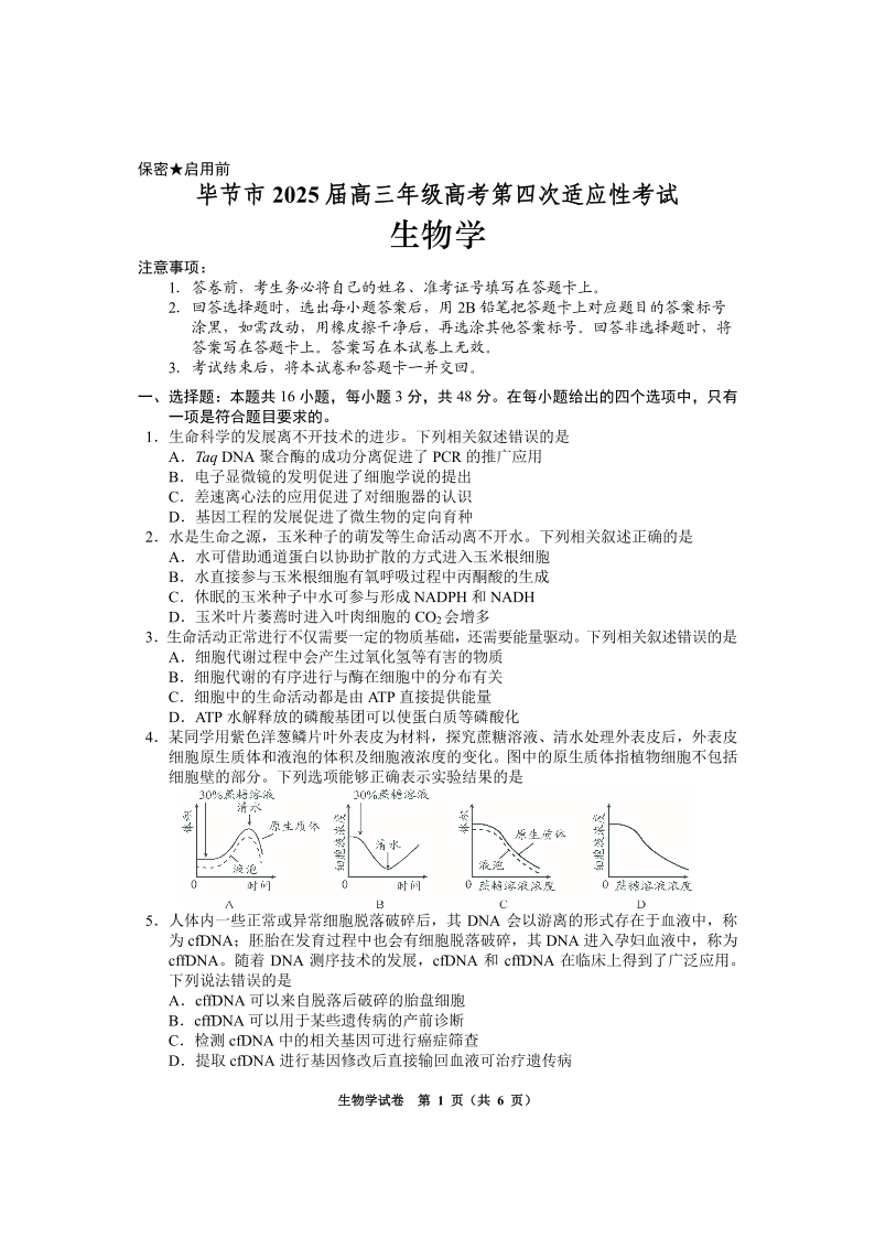 贵州省毕节市2025届高三年级高考第四次适应性考试 生物.pdf