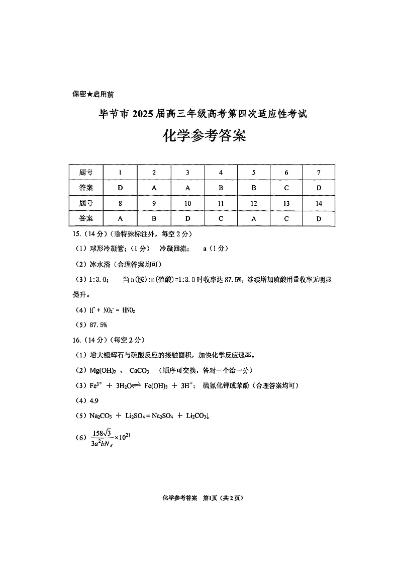 贵州省毕节市2025届高三年级高考第四次适应性考试 化学答案.pdf