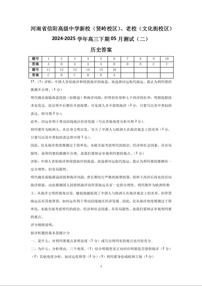 河南省信阳高级中学2025届高三下学期5月测试(二)历史答案.docx