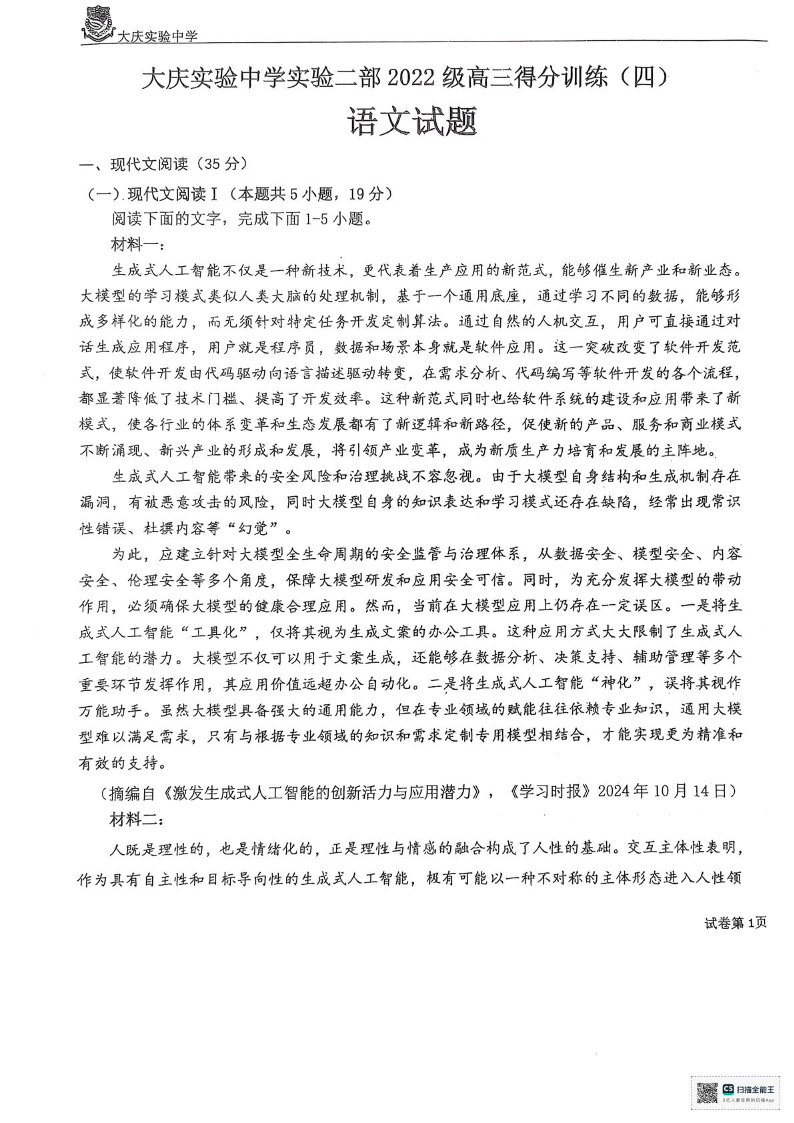 黑龙江省大庆实验中学二部2025届高三得分训练(四)语文.pdf