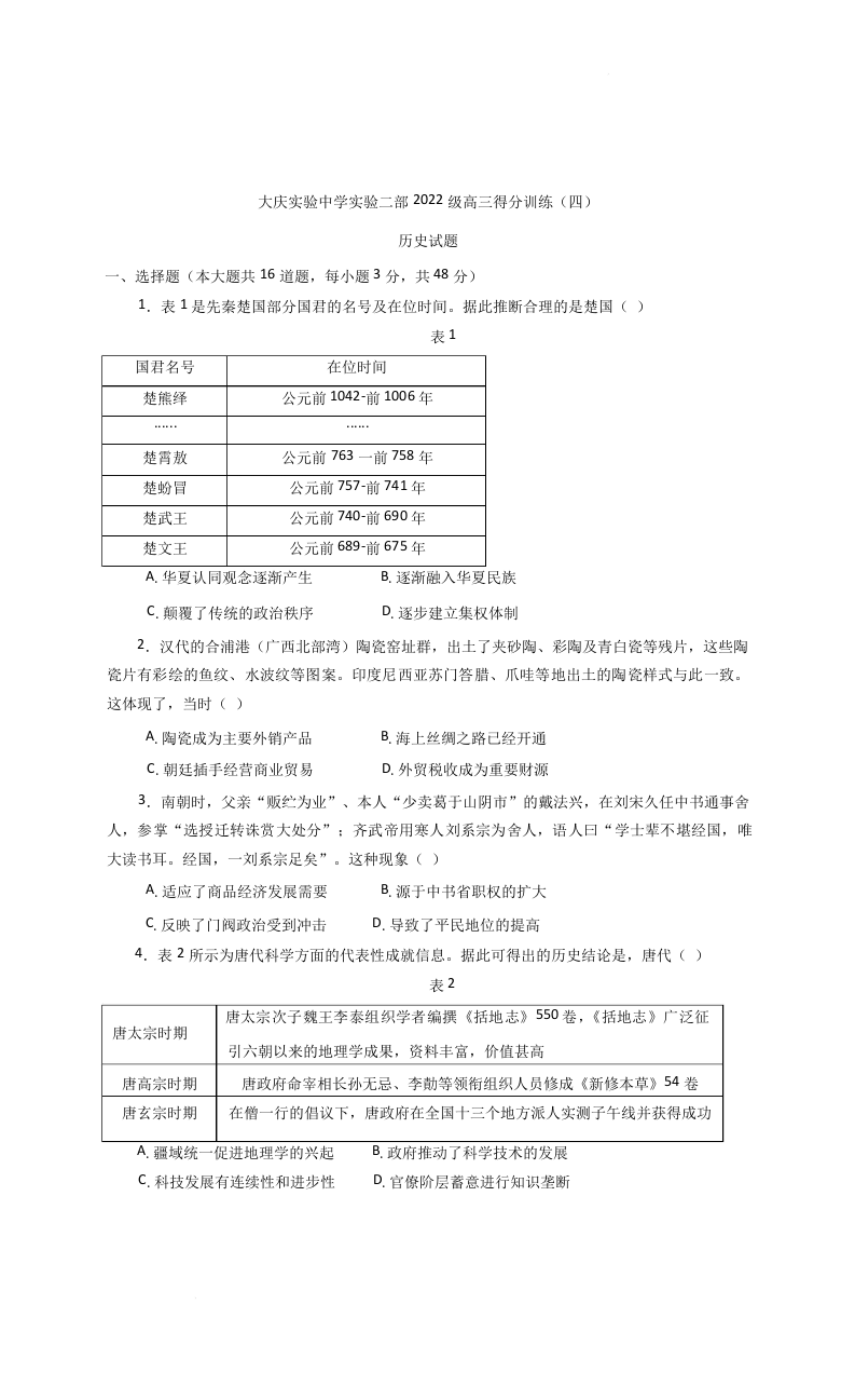 黑龙江省大庆实验中学二部2025届高三得分训练(四)历史(含答案).docx
