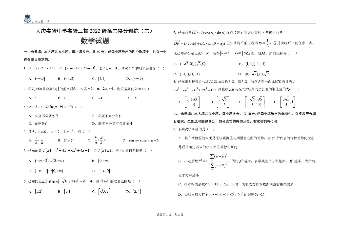 黑龙江省大庆实验中学二部2025届高三得分训练(三)数学.pdf
