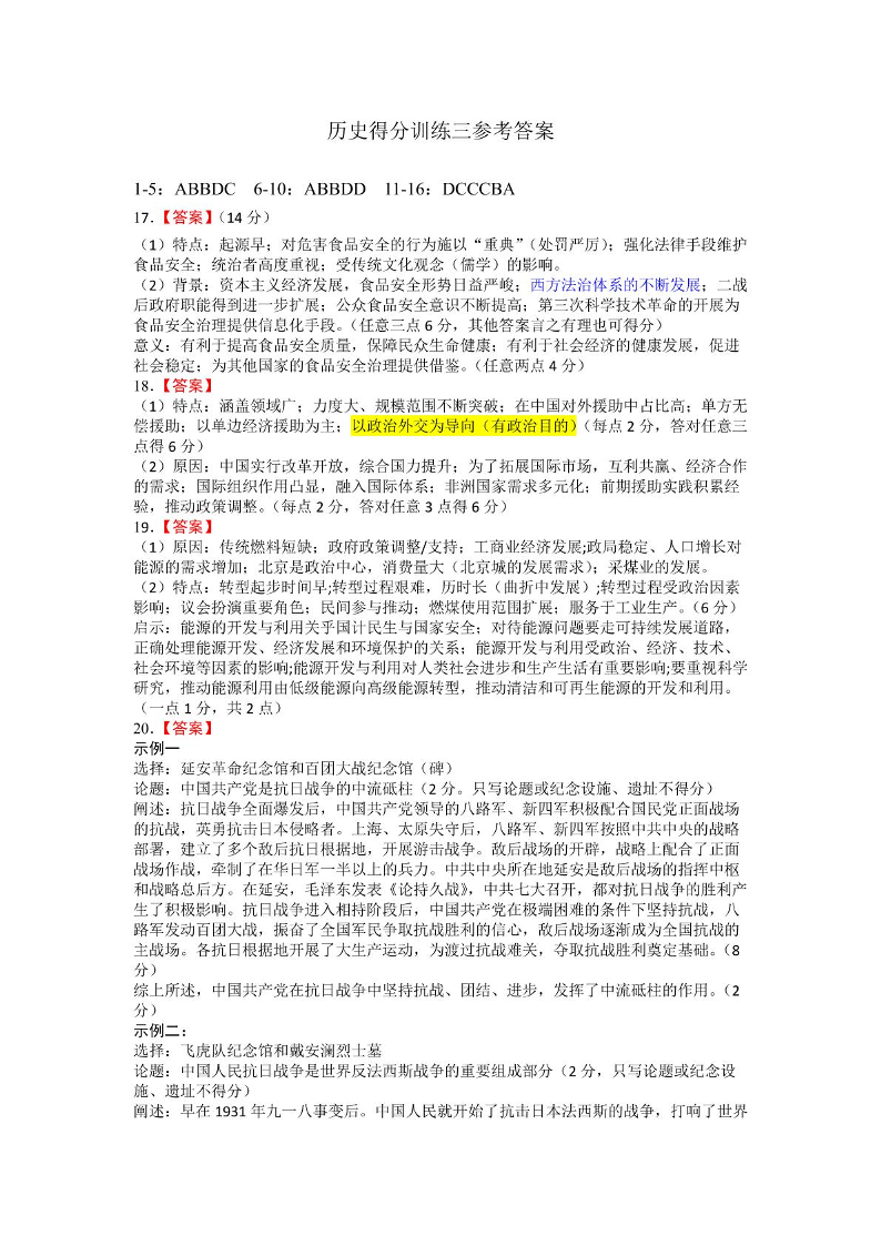 黑龙江省大庆实验中学二部2025届高三得分训练(三)历史答案.pdf