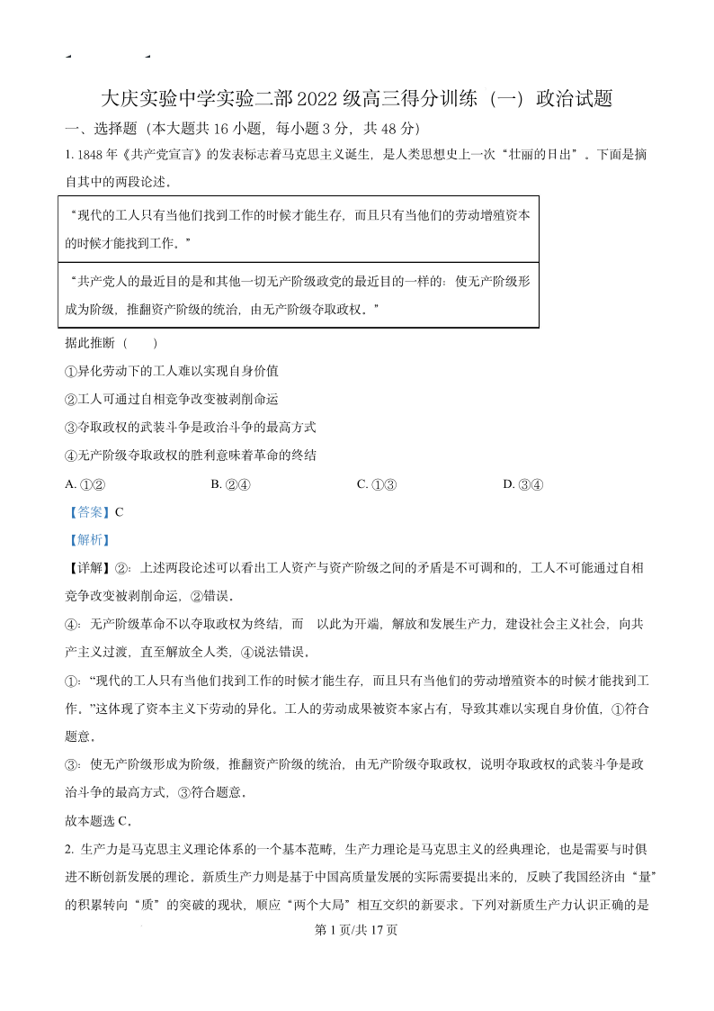 黑龙江省大庆实验中学二部2025届高三得分训练(一)政治答案.pdf