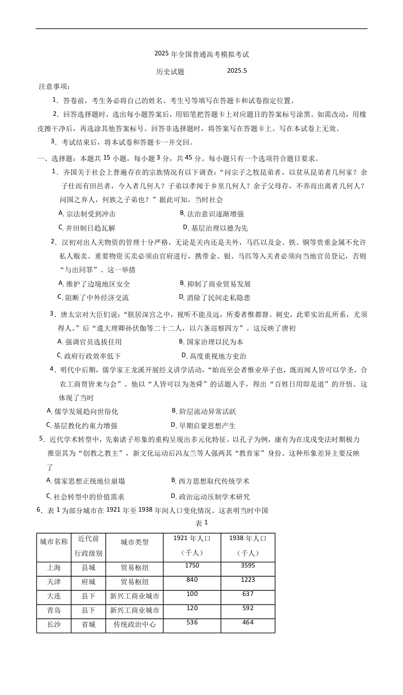 山东潍坊市2025年全国普通高考模拟考试 历史试题(含答案).docx