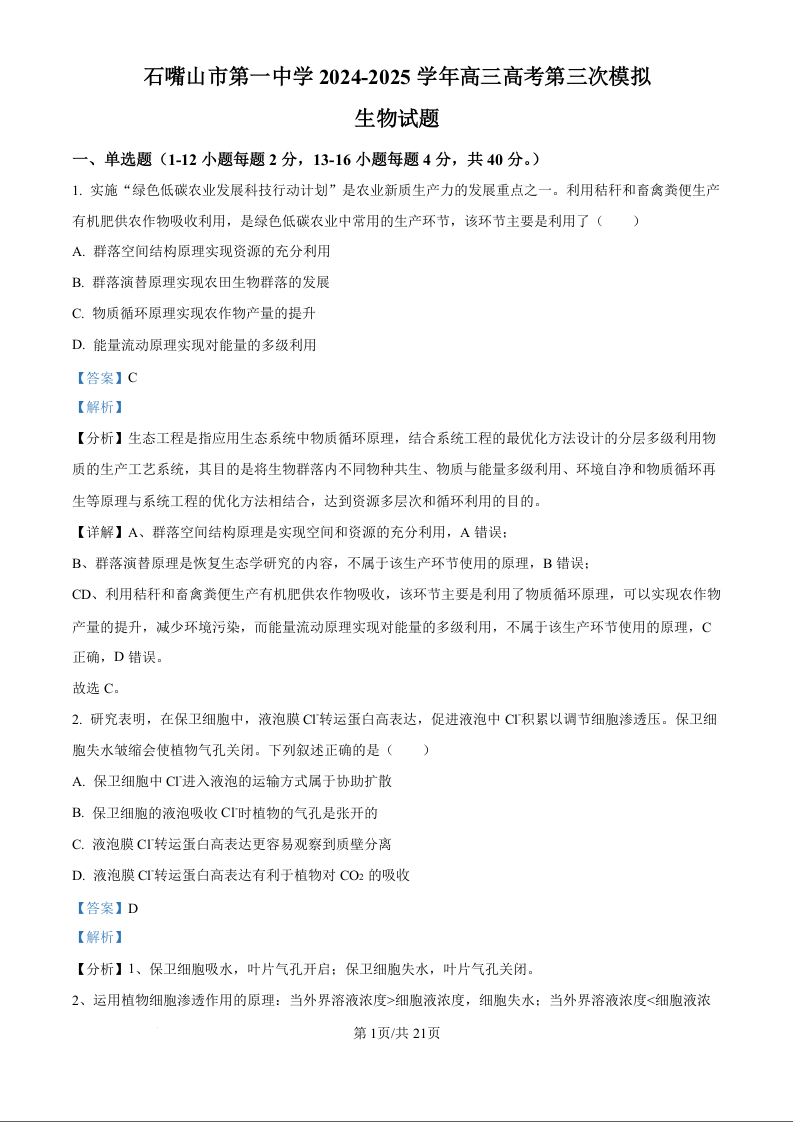宁夏石嘴山市第一中学高三年级高考第三次模拟考试 生物答案.docx