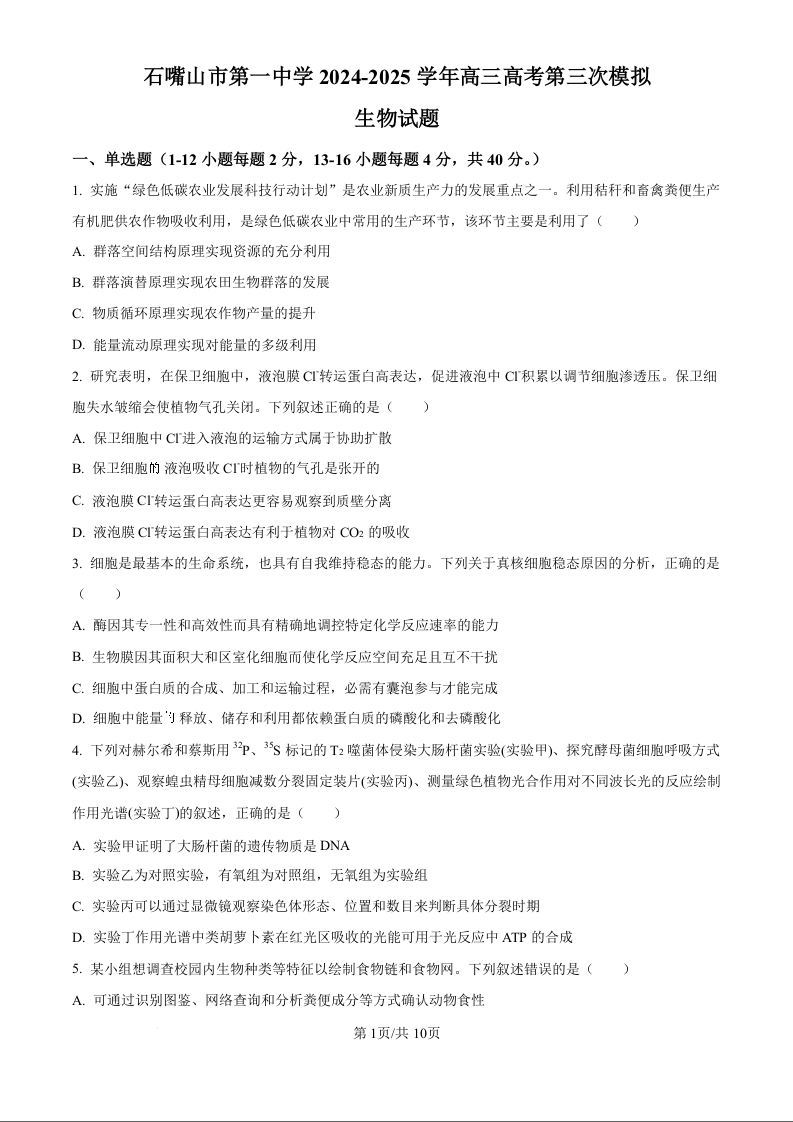 宁夏石嘴山市第一中学高三年级高考第三次模拟考试 生物.docx