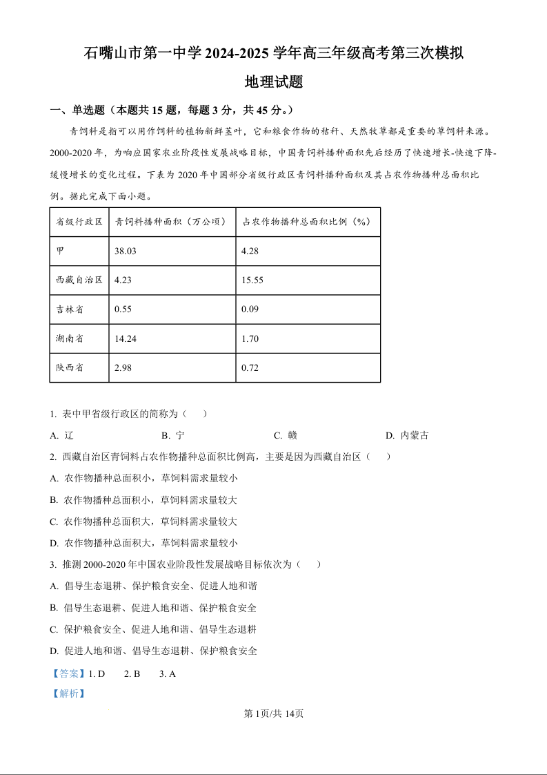 宁夏石嘴山市第一中学高三年级高考第三次模拟考试 地理答案.docx