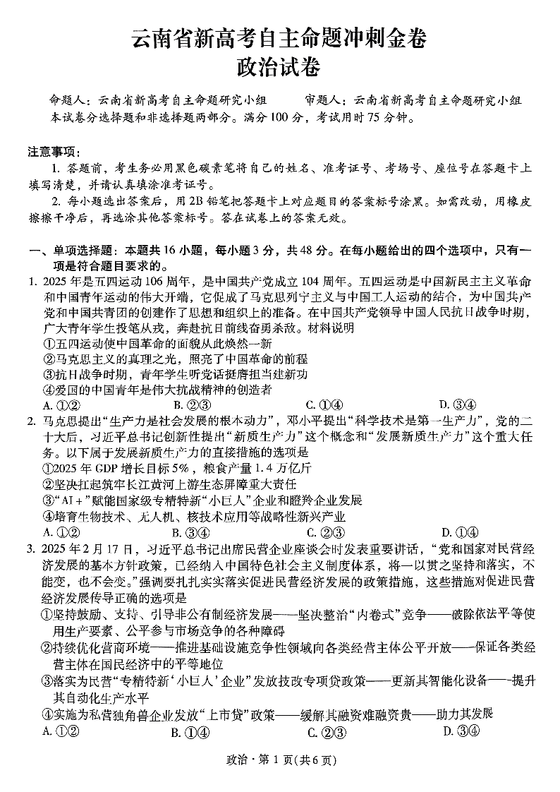 2025年云南省新高考自主命题冲刺金卷 政治试题(含答案).pdf