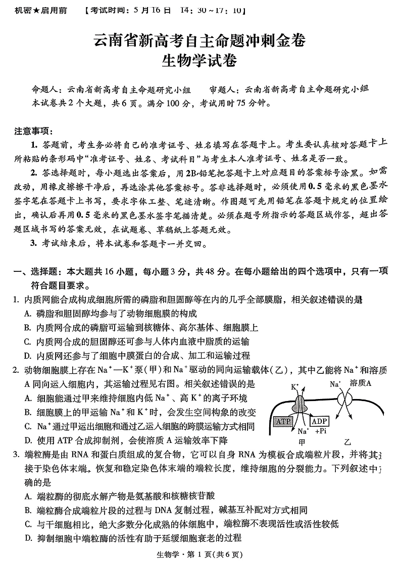 2025年云南省新高考自主命题冲刺金卷 生物试题(含答案).pdf
