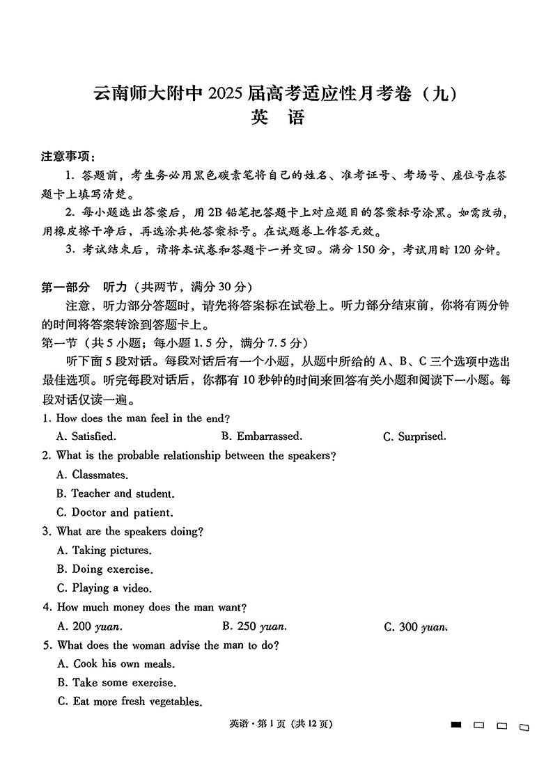 云南师大附中2025届高考适应性月考卷(九)英语试题(含答案).pdf