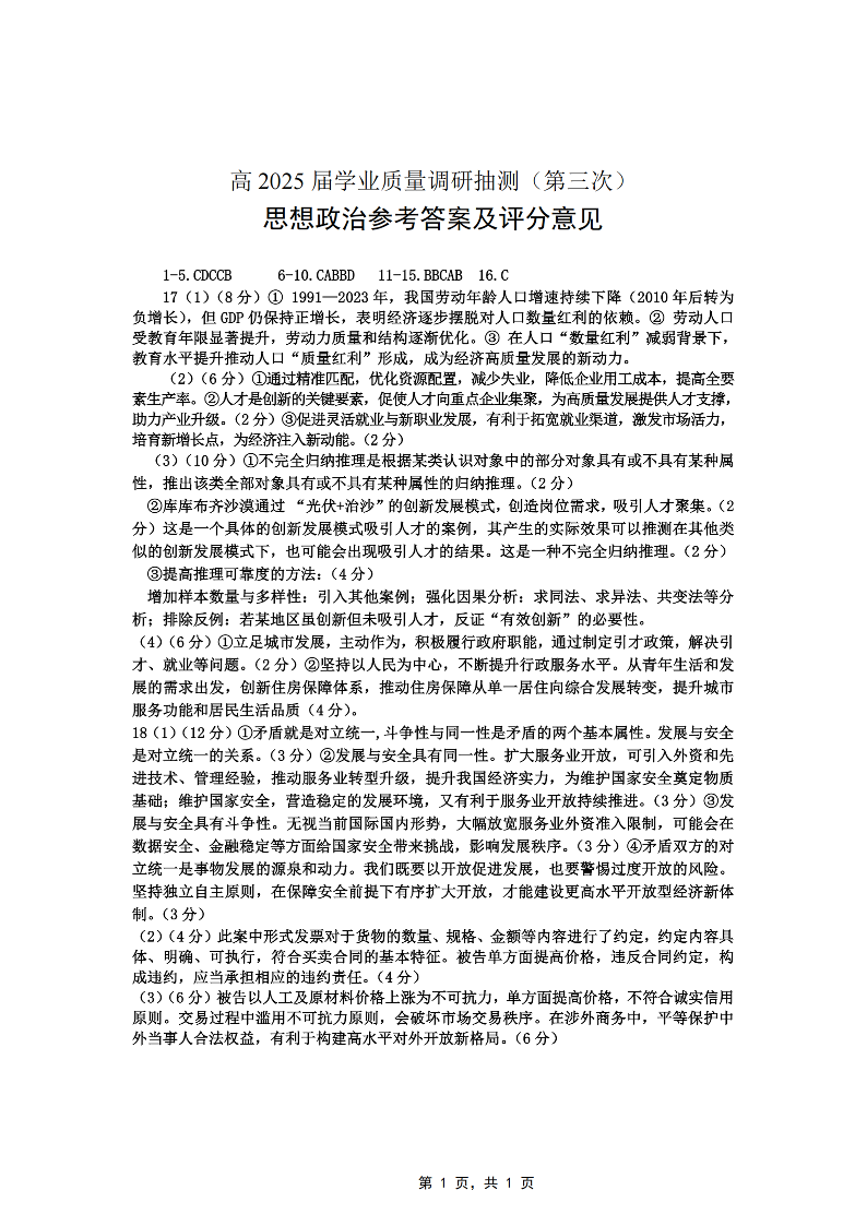 重庆市高2025届学业质量调研抽测(第三次)政治答案.pdf