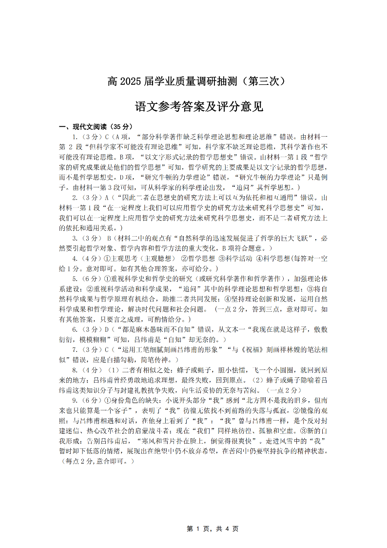 重庆市高2025届学业质量调研抽测(第三次)语文答案.pdf