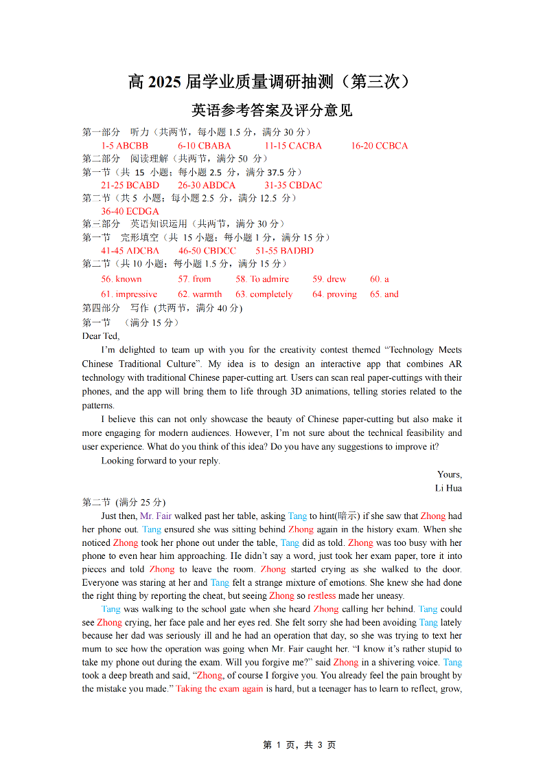 重庆市高2025届学业质量调研抽测(第三次)英语答案.pdf
