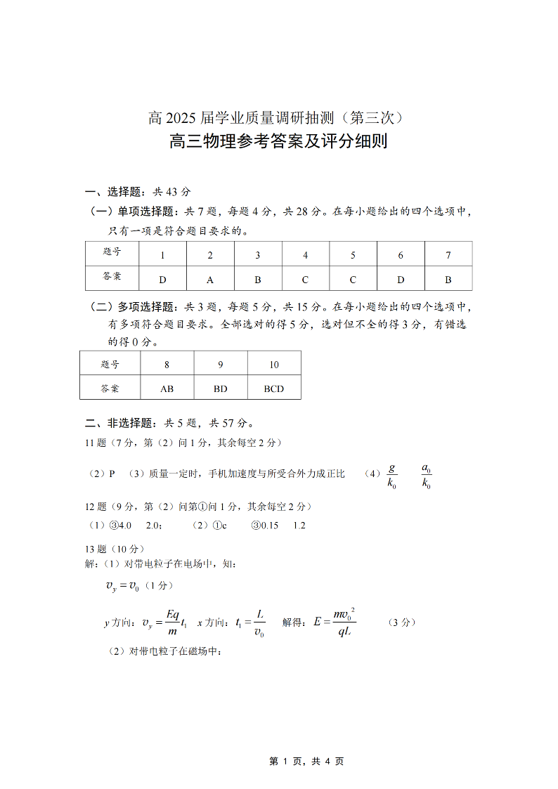 重庆市高2025届学业质量调研抽测(第三次)物理答案.pdf