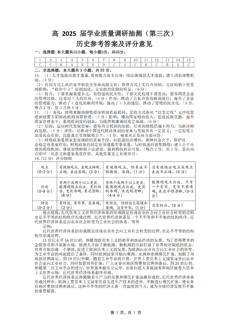 重庆市高2025届学业质量调研抽测(第三次)历史答案.pdf