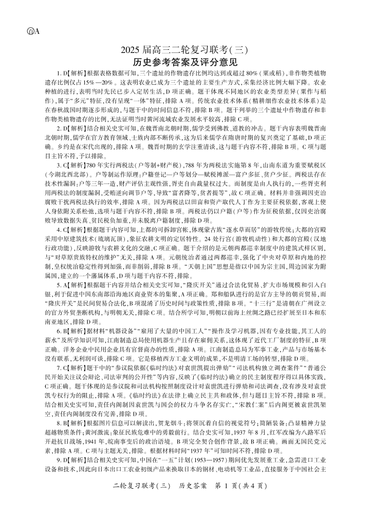 安徽省九师联盟2025高三二轮复习联考(三)历史答案.pdf