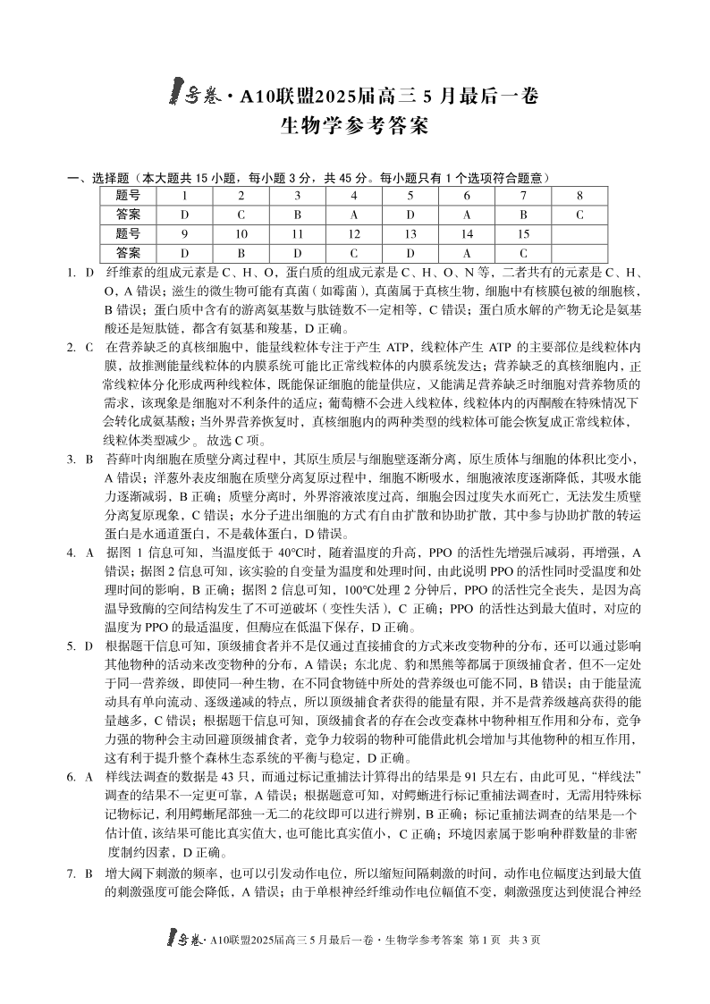 【生物答案】1号卷·A10联盟2025届高三5月最后一卷.pdf