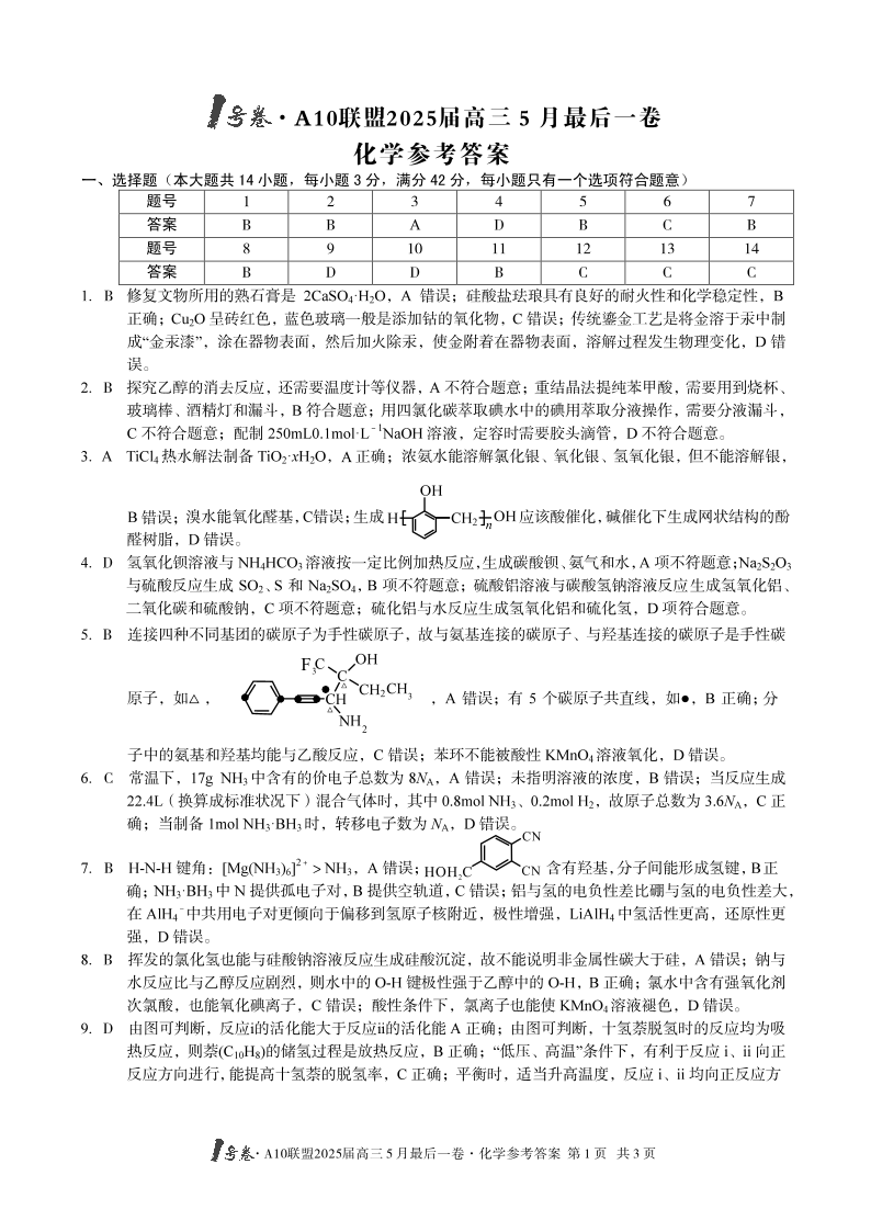 【化学答案】1号卷·A10联盟2025届高三5月最后一卷.pdf