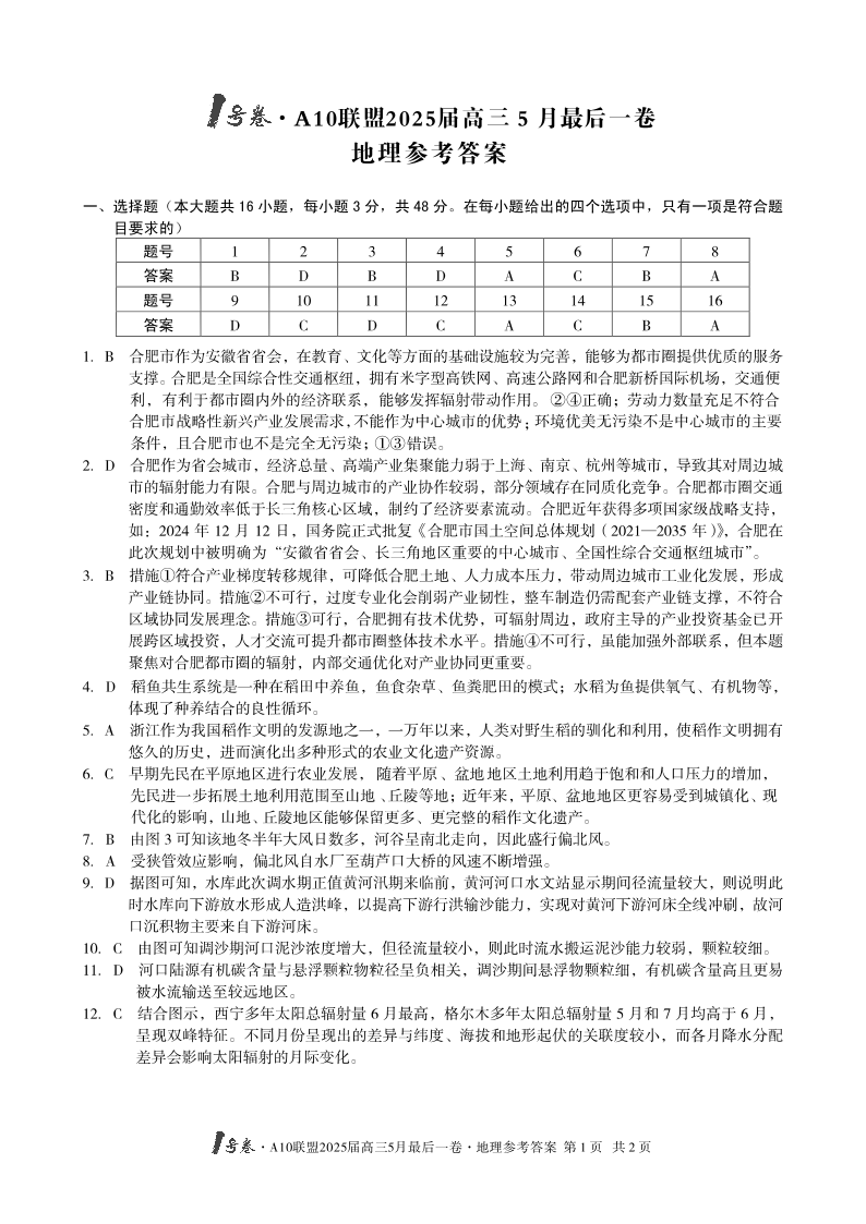 【地理答案】1号卷·A10联盟2025届高三5月最后一卷.pdf