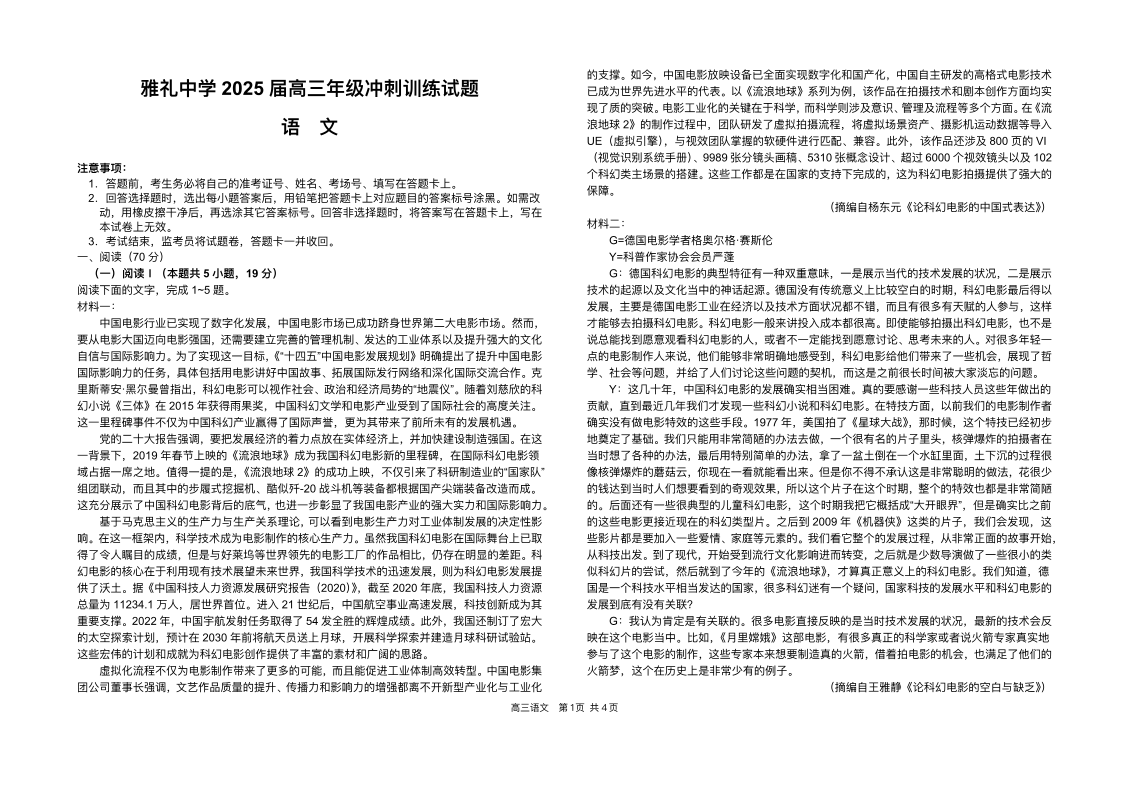 雅礼中学2025届高三年级冲刺训练试题 语文试题(含答案).pdf