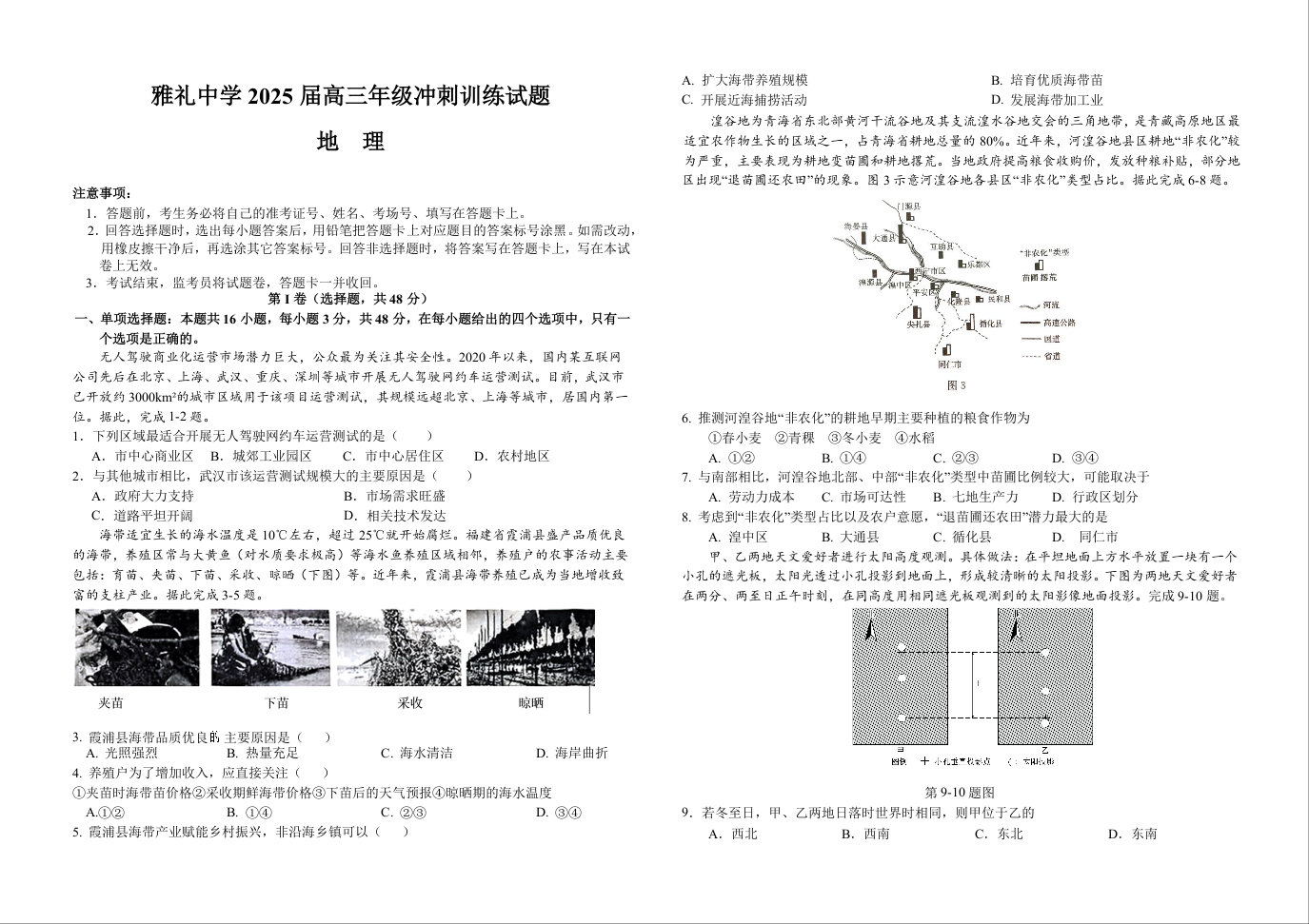 雅礼中学2025届高三年级冲刺训练试题 地理试题(含答案).docx