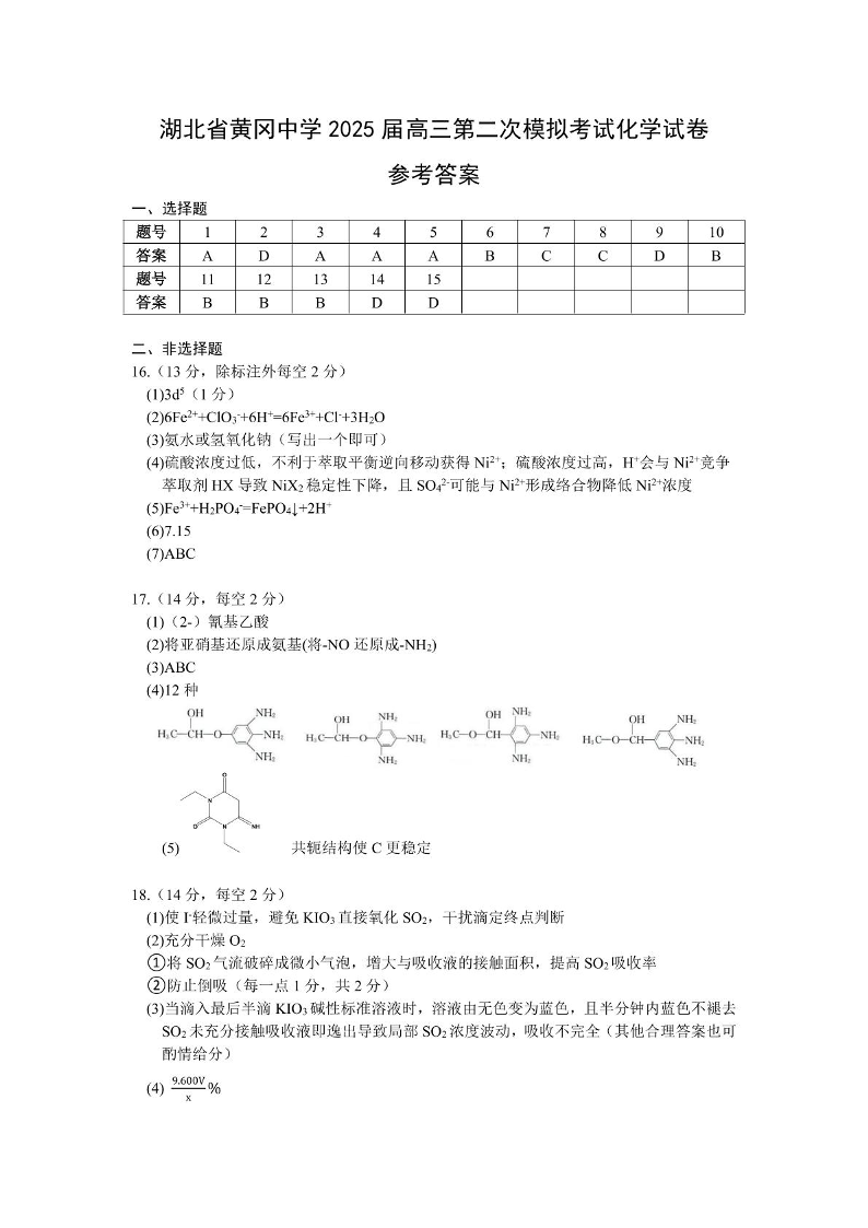 湖北省黄冈中学2025届高三5月第二次模模拟考试 化学答案.pdf
