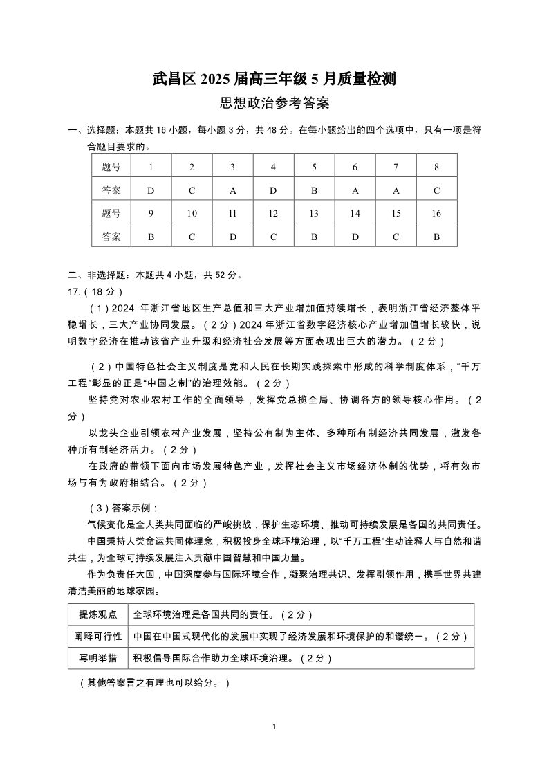 湖北省武昌区2025届高三年级5月质量检测 政治答案.pdf