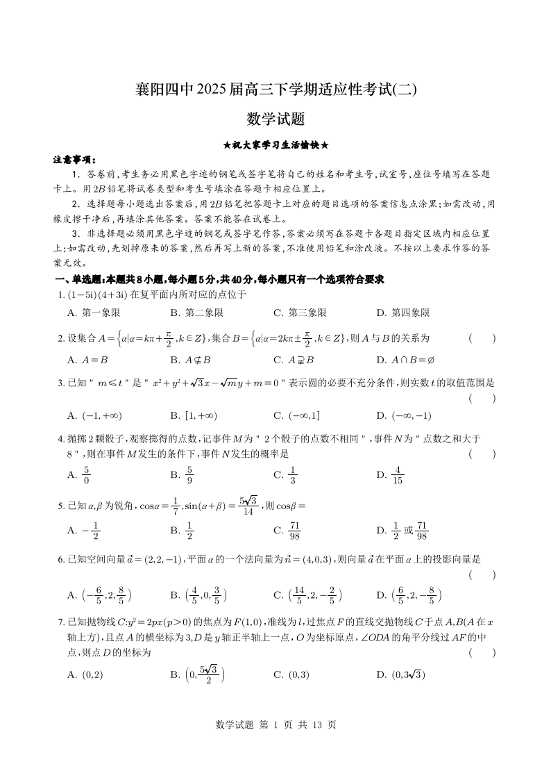 襄阳四中适应性考试(二)数学试卷及答案.pdf