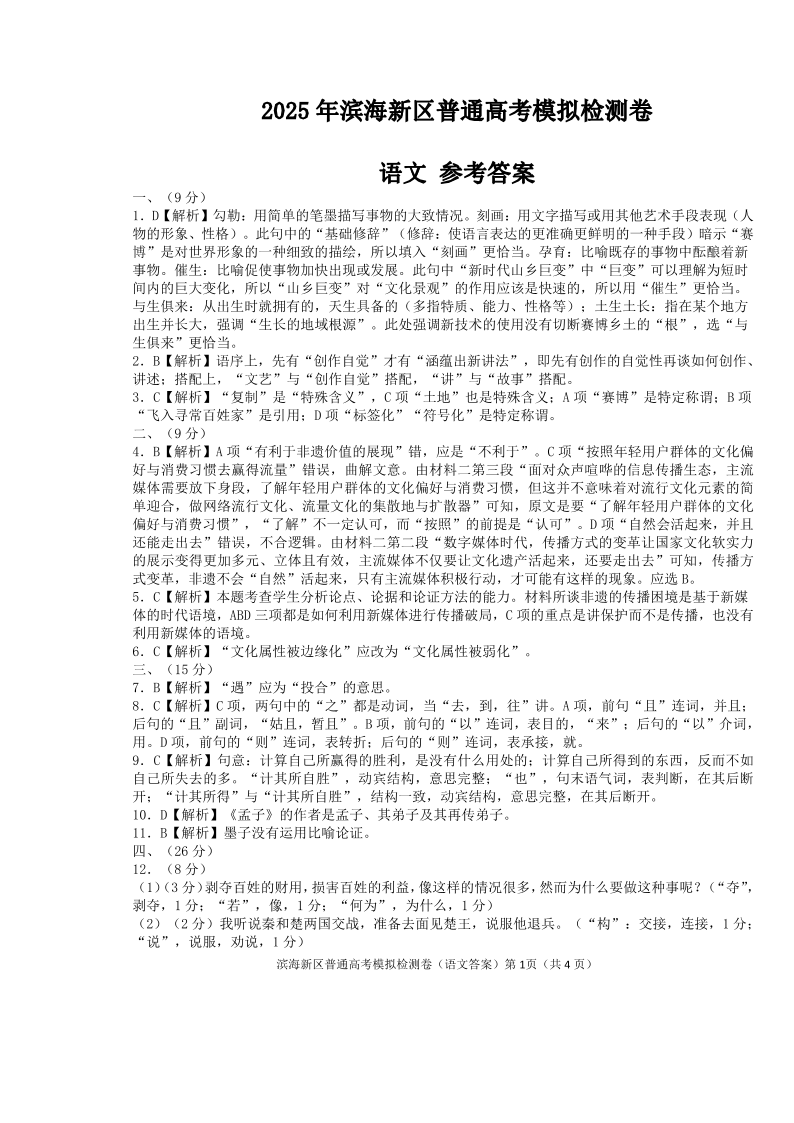 天津市滨海新区2025届高三下学期三模 语文答案.pdf