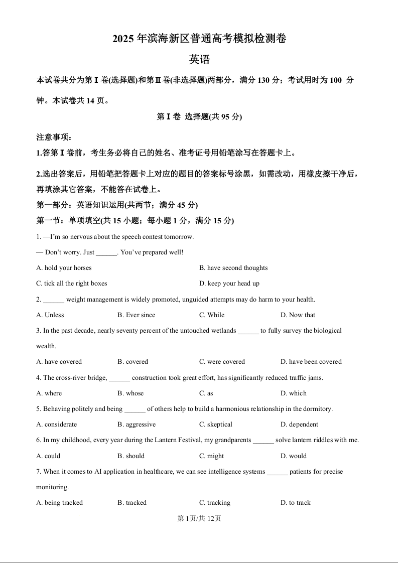 天津市滨海新区2025届高三下学期三模 英语.docx