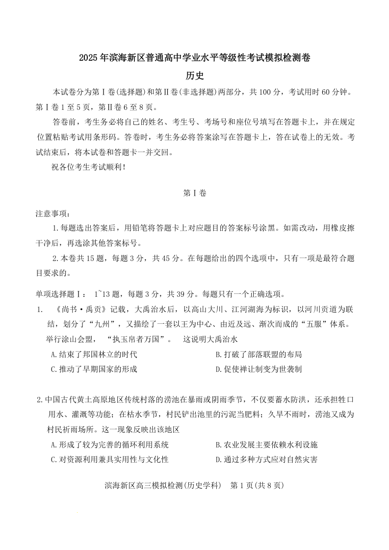 天津市滨海新区2025届高三下学期三模 历史.docx