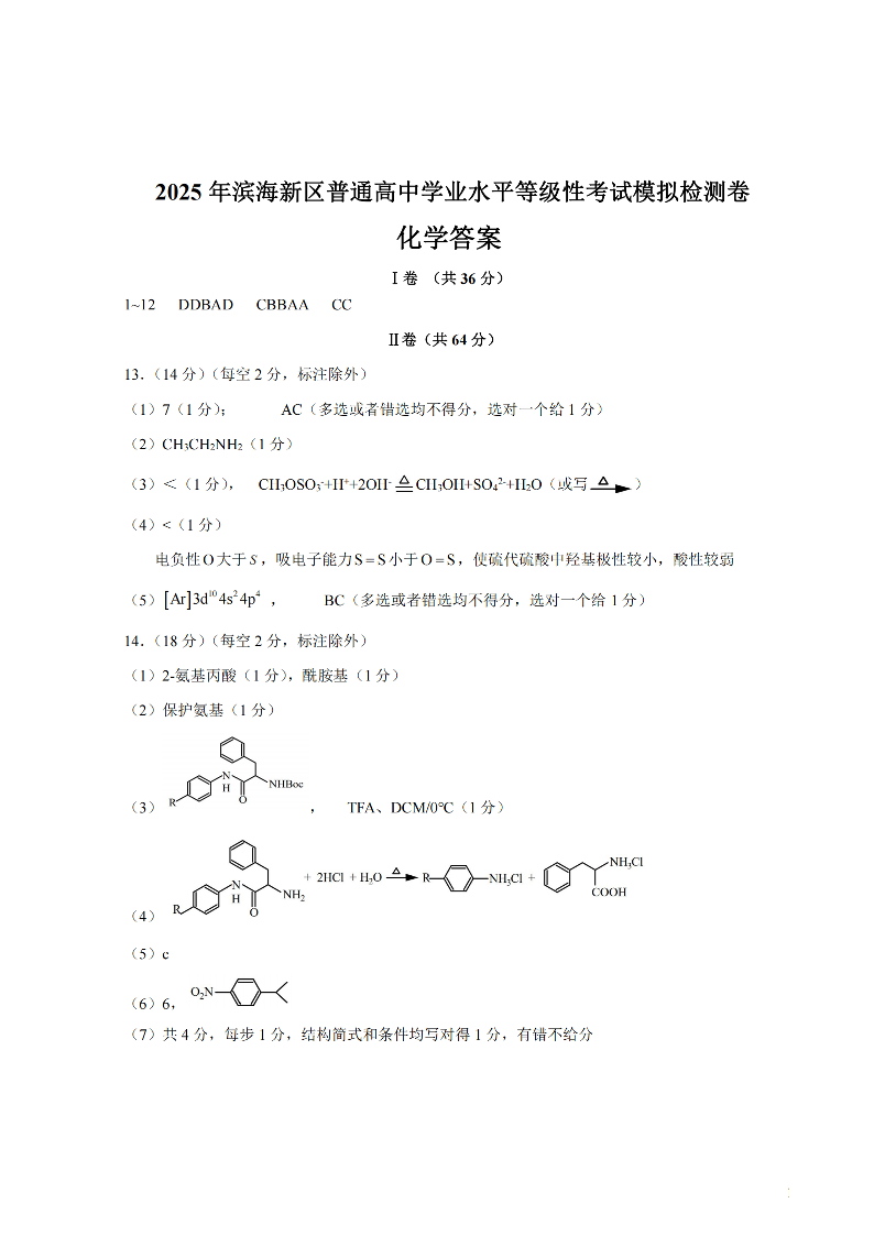 天津市滨海新区2025届高三下学期三模 化学答案.pdf