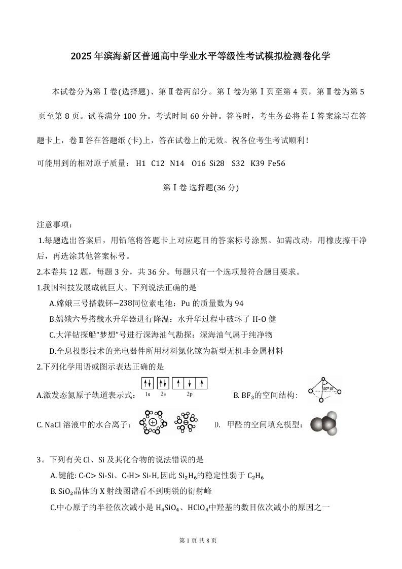 天津市滨海新区2025届高三下学期三模 化学.docx