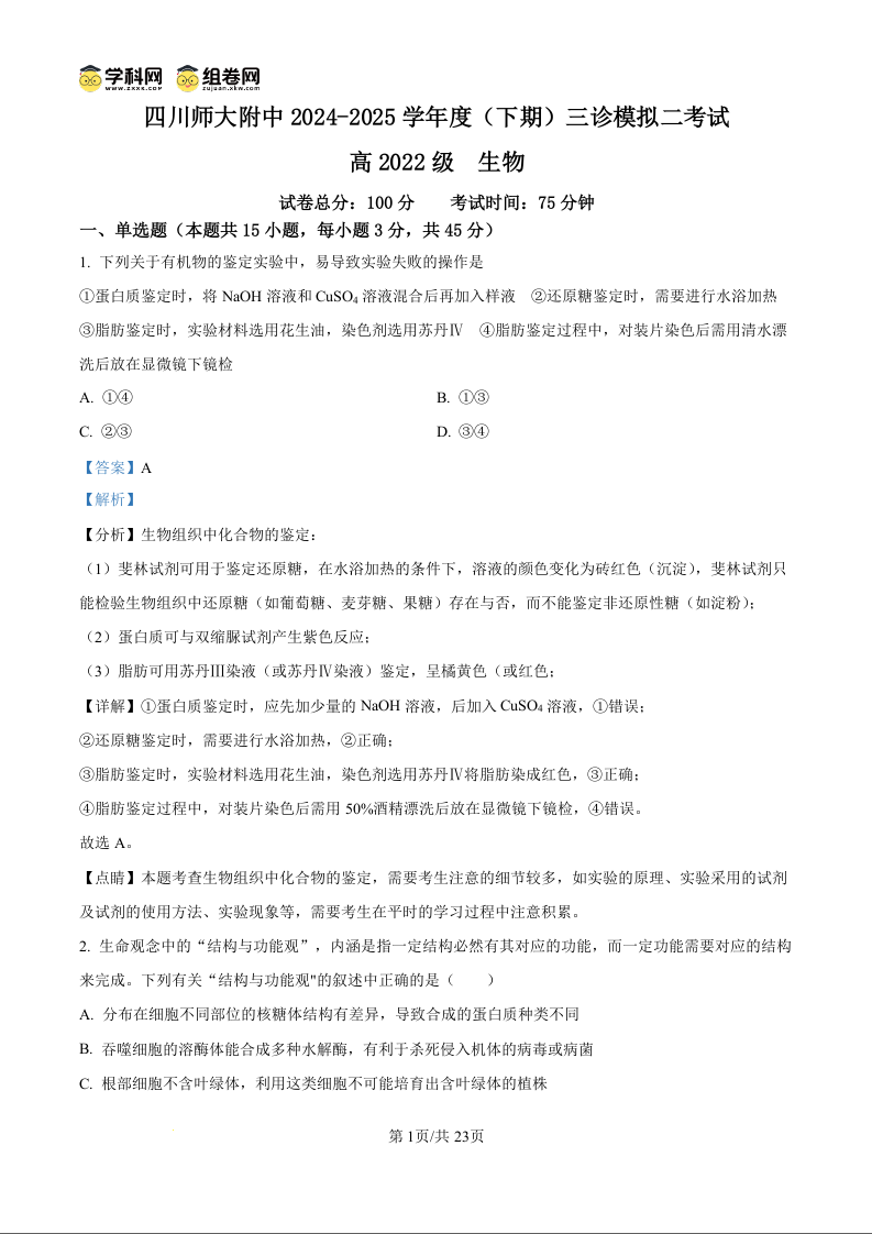 四川师范大学附属中学2025届高三下学期三诊模拟(二)生物答案.docx
