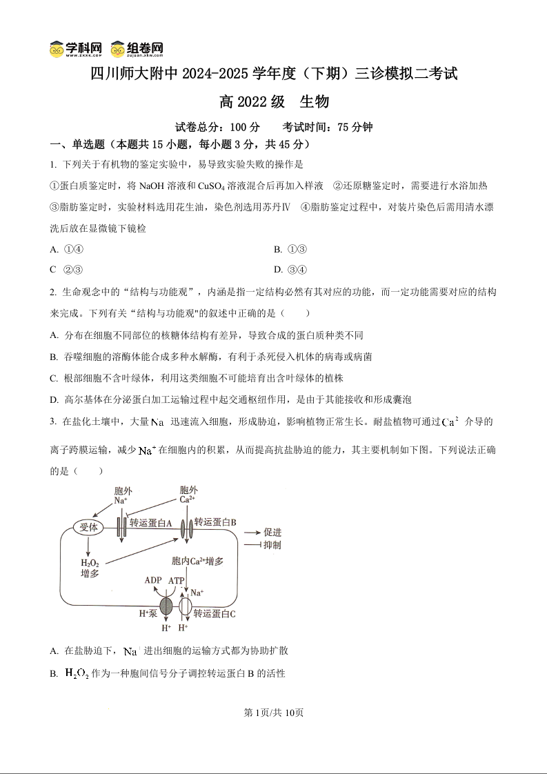 四川师范大学附属中学2025届高三下学期三诊模拟(二)生物.docx