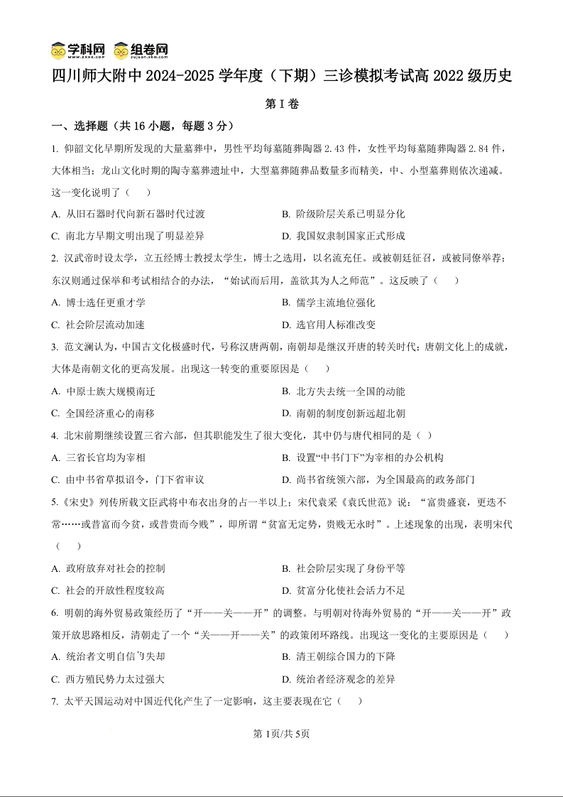 四川师范大学附属中学2025届高三下学期三诊模拟(二)历史.docx