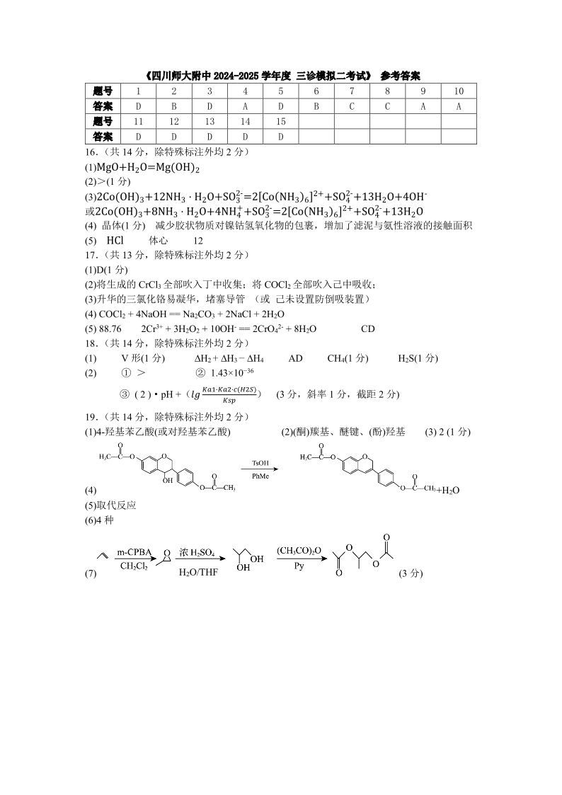 四川师范大学附属中学2025届高三下学期三诊模拟(二)化学答案..pdf