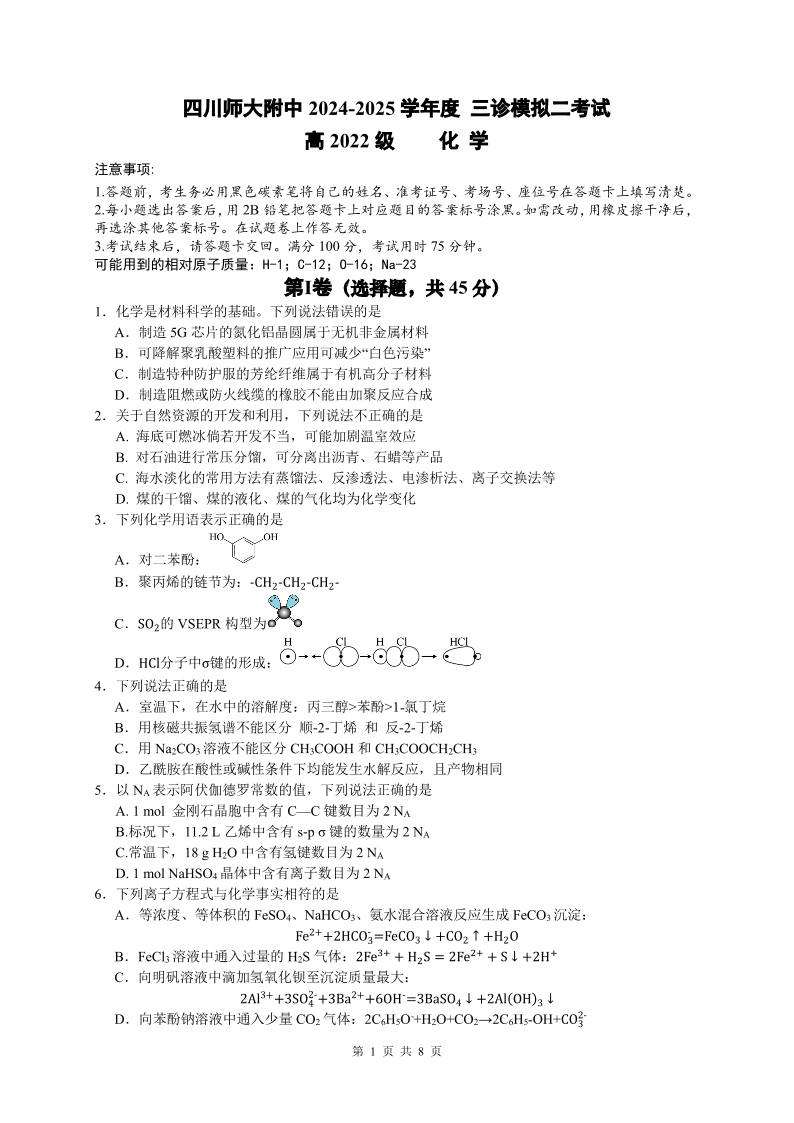 四川师范大学附属中学2025届高三下学期三诊模拟(二)化学.pdf