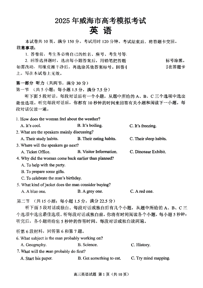 山东省2025年威海市高考模拟考试 英语.pdf