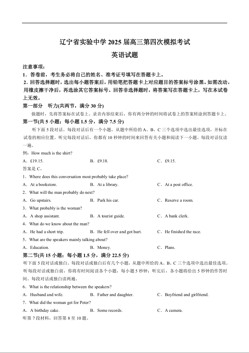 辽宁省实验中学2025届高三第四次模拟考试 英语试卷(含答案).docx