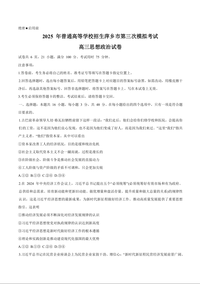 江西省萍乡市2025届高三下学期第三次模拟考试 政治试卷(含答案).docx