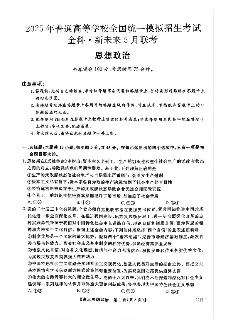河南省金科新未来2025届高三下学期5月联考 政治(含答案).pdf