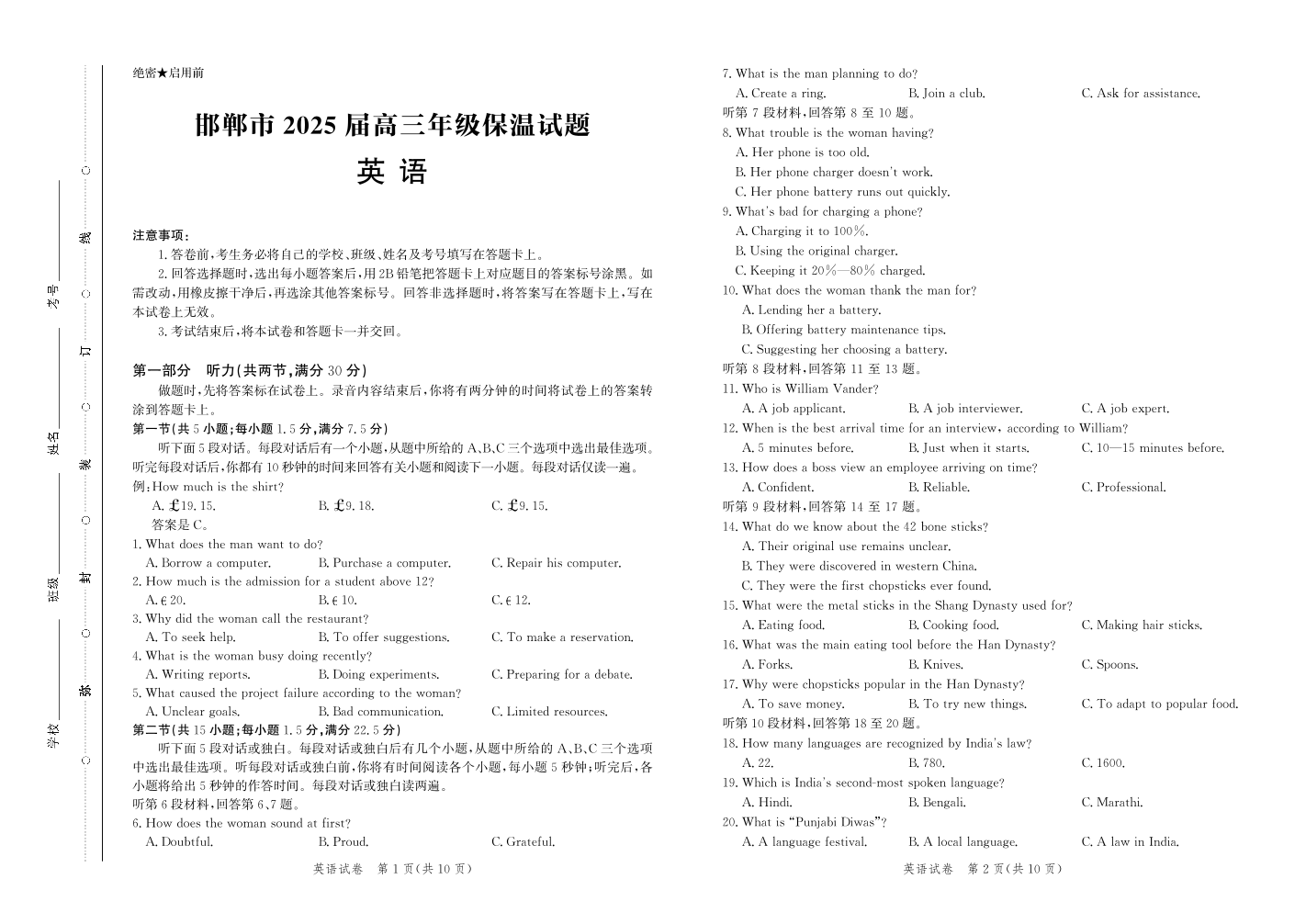 邯郸市2025届高三年级保温试题 英语.pdf