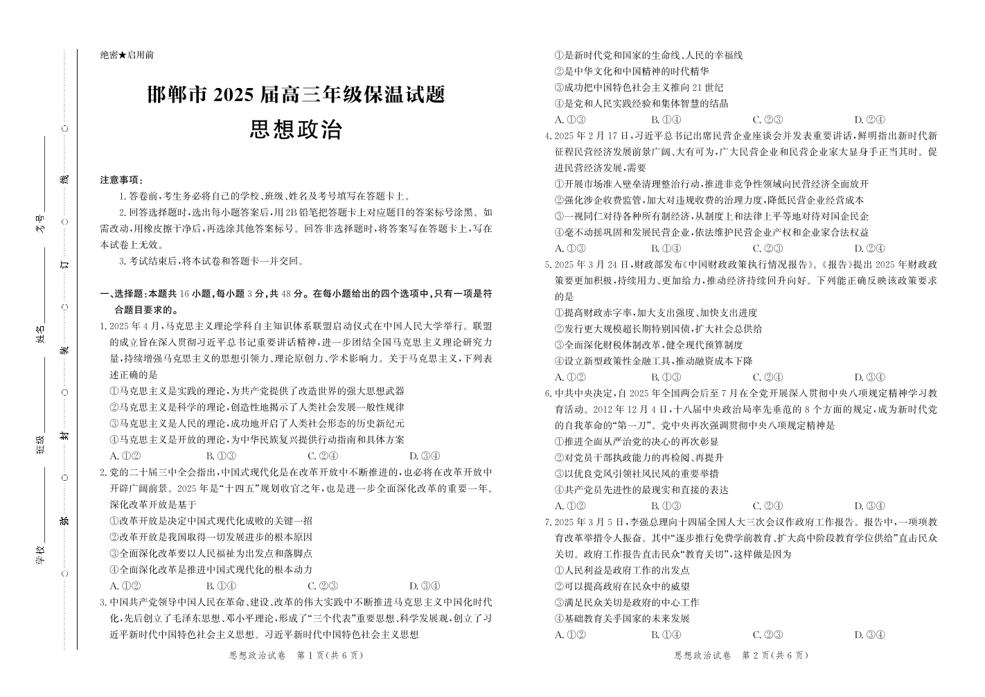 邯郸市2025届高三年级保温试题 思政.pdf