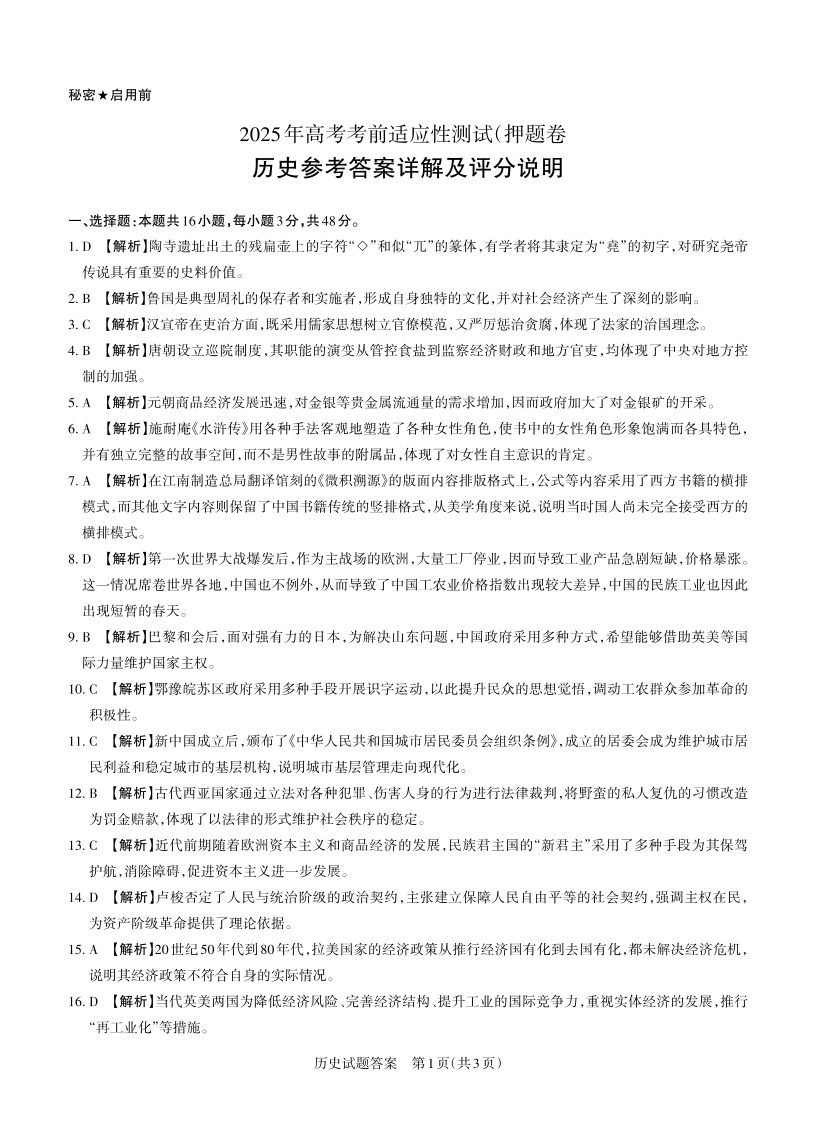 山西省2025年5月高考考前适应性测试 历史答案.pdf