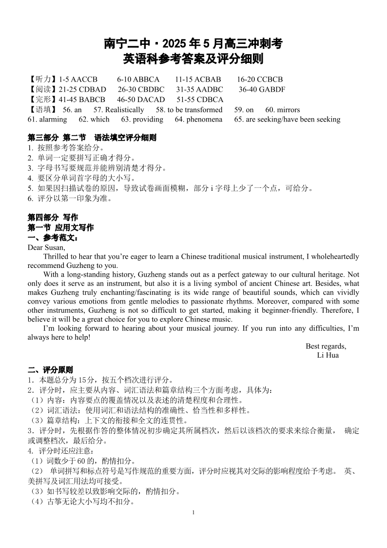 南宁二中2025年5月高三冲刺考 英语评分标准.pdf