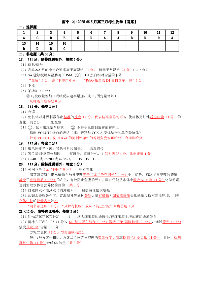 南宁二中2025年5月高三冲刺考 生物评分细则.pdf